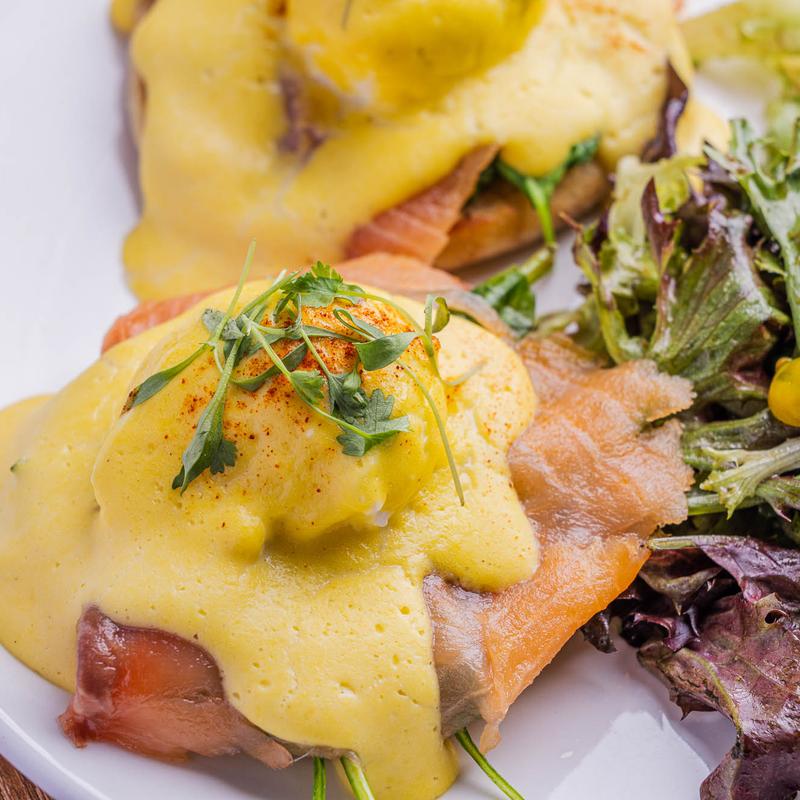 Poached Eggs, Smoked Salmon and Spinach on an English muffin, topped with hollandaise sauce